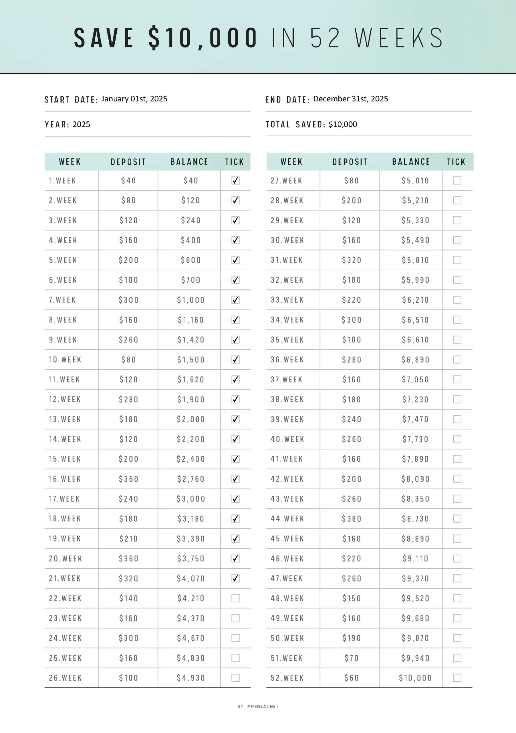 10000 Saving Challenge 52 Weeks
